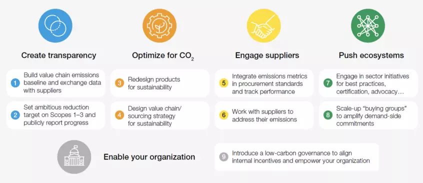 Eight supply chains account for more than 50% of global CO2 emissions. Fully decarbonizing these would add just 1-4% to end-consumer costs for many everyday items. There are nine major actions that every CEO can take to engage suppliers and decarbonize their end-to-end supply chain.
