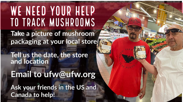 Ostrom Mushroom - where workers have been demanding union recognition - has been sold to a Canadian private equity firm. Given the scale of operations & the serious labor issues, we need YOUR help tracking how the mushroom supply chain moves. Take a picture of mushroom packaging at your local store. Tell us the date, the store and location. Email to ufw@ufw.org